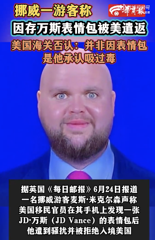 美国海关称游客被拒入境因吸毒。据英国《每日邮报》24日报道,挪威游客麦斯·米克尔森(Mads Mikkelsen)声称,美国移民官员在其手机上发现一张JD·万斯(JD Vance)的表情包后,他遭到骚扰并被拒绝入境美国。美国海关与边境保护局辟谣此消息为假新闻,称该游客因吸毒行为而被拒绝入境美国。21岁的麦斯·米克尔森于6月11日抵达新泽西州的纽瓦克机场,对这次假期充满期待。然而,当他被边境管制人员拉到一边并被关进牢房时,他的计划被打乱了。这名游客向挪威媒体Nordlys描述他遭受了“滥用职权和骚扰”。他告诉该媒体:“他们毫无缘由地询问有关毒品贩运、恐怖主义阴谋和右翼极端主义的问题。”米克尔森先生声称,官员们随后威胁他,如果拒绝交出手机密码,将面临5000美元罚款或五年监禁。据报道,警卫在该设备的相册中发现了一张表情包,图片中的美国副总统JD·万斯被P成了光头、鸡蛋形状的头。米克尔森说,在发现这张图片后,当局于当天将他遣返回挪威。