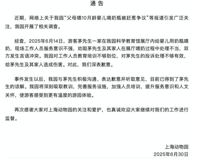 6月30日晚,上海动物园发布通告致歉。通告称,近期关于该园“父母喂10月龄婴儿喝奶瓶被赶惹争议”的报道引发广泛关注,园方进行了相关调查。经核实,2025年6月14日,游客茅先生一家在科学教育馆展厅内给婴儿用奶瓶喂奶,现场工作人员服务意识不强,劝阻过程中处理不当,双方发生言语冲突。园方对工作人员教育培训不够到位,对茅先生的投诉处理也不够有效,给茅先生及其家人造成伤害。对此,园方深表歉意。