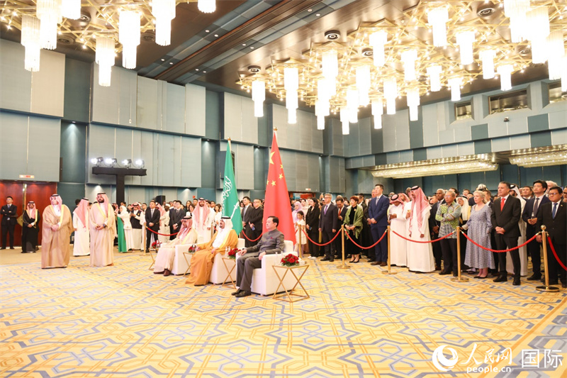 人民网利雅得9月26日电(记者任皓宇)9月25日,中国驻沙特使馆举行招待会,热烈庆祝中华人民共和国成立76周年和中沙建交35周年。沙特利雅得地区副埃米尔穆罕默德·本·阿卜杜拉赫曼亲王、沙内政部副大臣阿卜杜勒阿齐兹·阿亚夫亲王、沙外交部次大臣赛马里以及沙政府有关部门和军队高级官员,各国驻沙使节和伊斯兰合作组织代表,沙各界友好人士,在沙中资机构、教师留学生、华侨华人代表约600人出席。