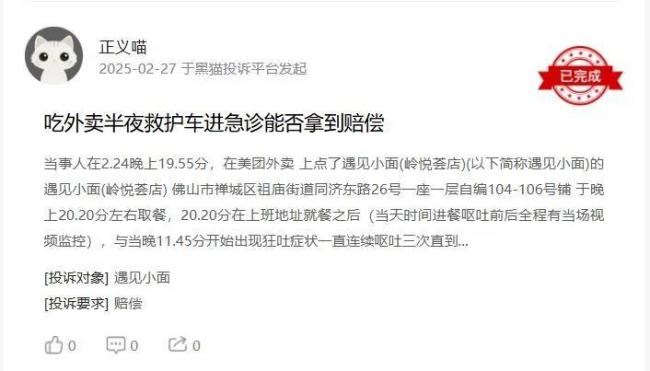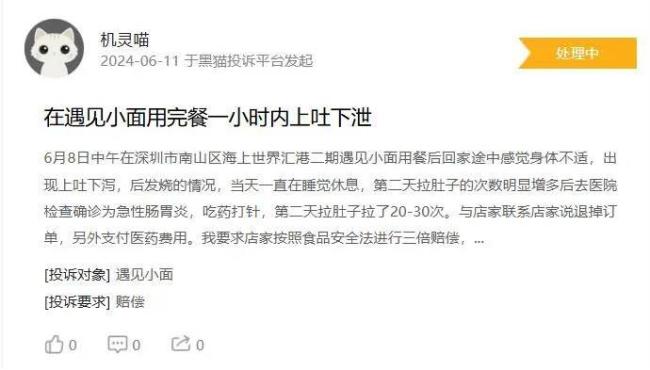在黑猫投诉平台上,今年2月27日,一消费者投诉称,2月24日20时20分在上班地点吃了遇见小面(佛山市禅城区祖庙街道岭悦荟店)外卖,当晚23时45分出现狂吐症状,一直呕吐到次日凌晨3时30分左右,救护车送往南海桂城医院急诊治疗,确诊肠胃炎(细菌性)。