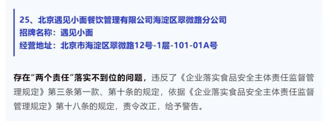 2024年6月28日,北京消协公众号通报,当年6月10日至24日,海淀区市场监督管理局持续开展餐饮食品安全大检查工作,对海淀区32家餐饮门店进行了依法查处。其中,遇见小面赫然在列。