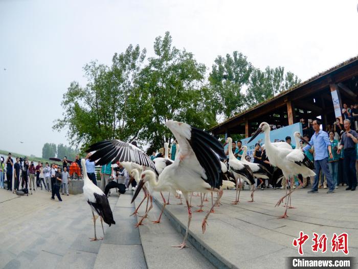 江苏盐城:十六只国家一级保护动物东方白鹳放归自然