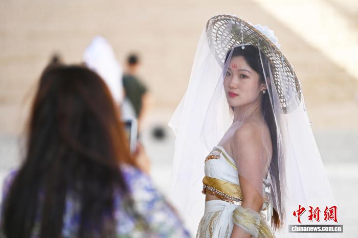 9月23日,甘肃省嘉峪关市嘉峪关关城文物景区内,游人进行旅拍。中新社记者 李亚龙 摄