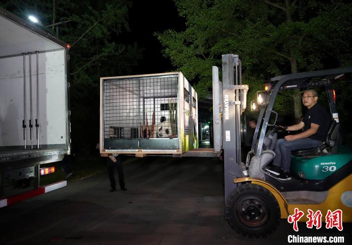 4月22日晚,中国大熊猫保护研究中心都江堰基地,大熊猫“荷风”装在转运箱中转运。中新社记者 安源 摄