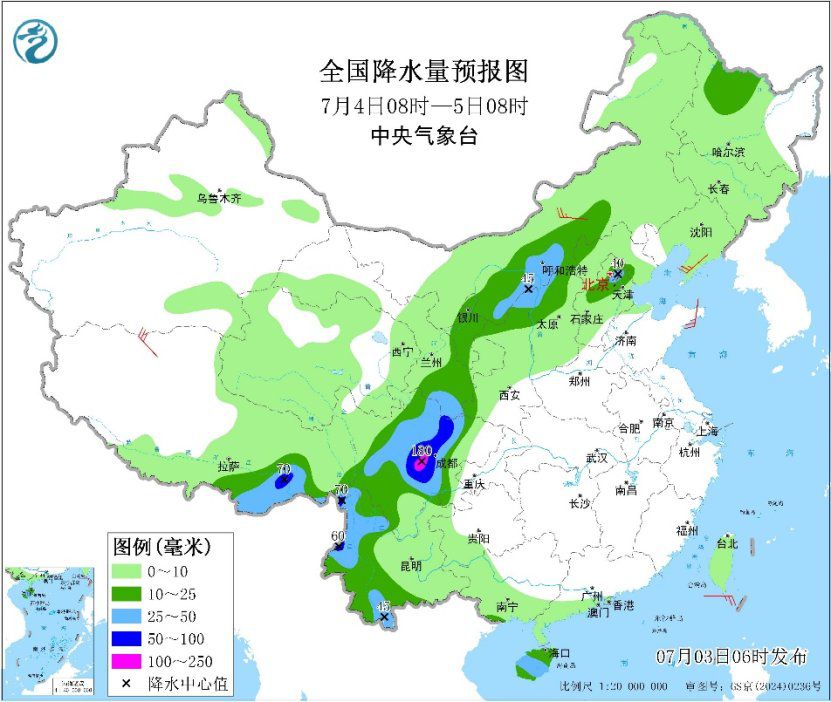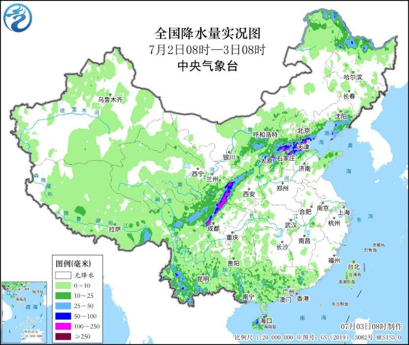 降雨方面,昨日,四川盆地、甘肃及华北一带出现较强降雨,气象监测显示,四川盆地西部、甘肃东部、山西中部、河北中部和东北部、天津南部、辽宁半岛等地部分地区出现暴雨或大暴雨,河北沧州局地特大暴雨(250~321毫米)。