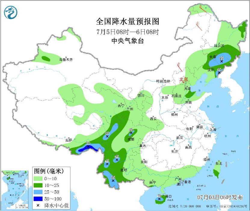 预计未来三天,东北地区、华北、西北地区东部、四川盆地西部、云南等地仍多降雨。其中今天,吉林东南部、辽宁中东部、山东北部、青海东部、宁夏南部、陕西西南部、甘肃南部、四川盆地西部、云南西部和南部、海南岛、西藏东南部等地部分地区有大到暴雨,辽宁东部、吉林东南部、甘肃东南部、四川盆地西北部等局地有大暴雨(100~180毫米);上述部分地区伴有短时强降水,东北地区西部和南部、华北东部等地部分地区有8级以上雷暴大风或冰雹天气,辽宁南部局地有10级以上雷暴大风,最大风力可达11级以上。