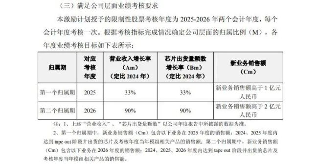 其中,第一个归属期(2025年),安凯微考核营业收入增长率达33%,芯片出货量颗数增长率达33%,新业务销售额高于1亿元人民币。