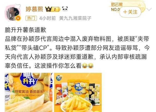 官媒批孙颖莎代言事件,网友:很失望 信任危机浮现。孙颖莎因为一包薯条陷入了舆论风波,连官媒《东方体育日报》都进行了点名,事情变得微妙起来。起因是国产薯条品牌“脆升升”邀请孙颖莎代言,但在制作周边产品时出了问题,把一些印错的废弃物料发了出去。由于涉及食品,加上代言人是孙颖莎,粉丝和大众的情绪被点燃。