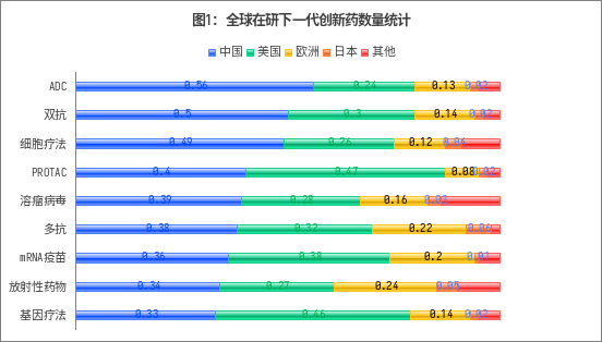 此外,在双抗、ADC、细胞疗法、多抗、溶瘤病毒、mRNA疫苗、放射性药物赛道上,中国的占比都超过了欧洲和日本。在基因疗法和PROTAC(蛋白降解剂)领域,中国也远超欧洲和日本,略低于美国。
