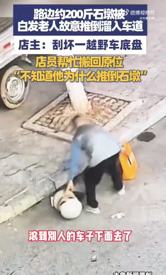 白发老人故意推倒路边200斤石墩。9月22日,湖南邵东,路边约200斤石墩被白发老人推倒,溜入车道,店主称:“刮坏一辆越野车底盘,店员帮忙搬回原位,不知道他为什么要推倒石墩。