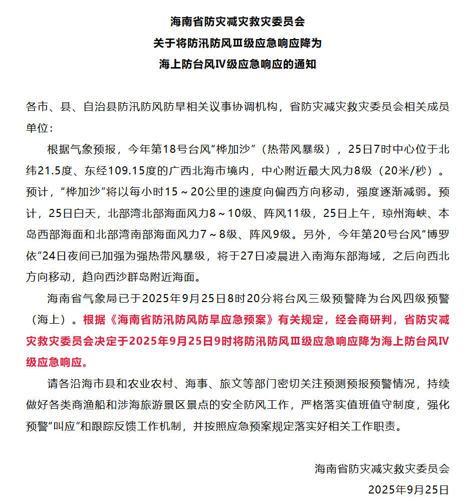 海南省气象局已于2025年9月25日8时20分将台风三级预警降为台风四级预警(海上)。根据《海南省防汛防风防旱应急预案》有关规定,经会商研判,省防灾减灾救灾委员会决定于2025年9月25日9时将防汛防风Ⅲ级应急响应降为海上防台风Ⅳ级应急响应。