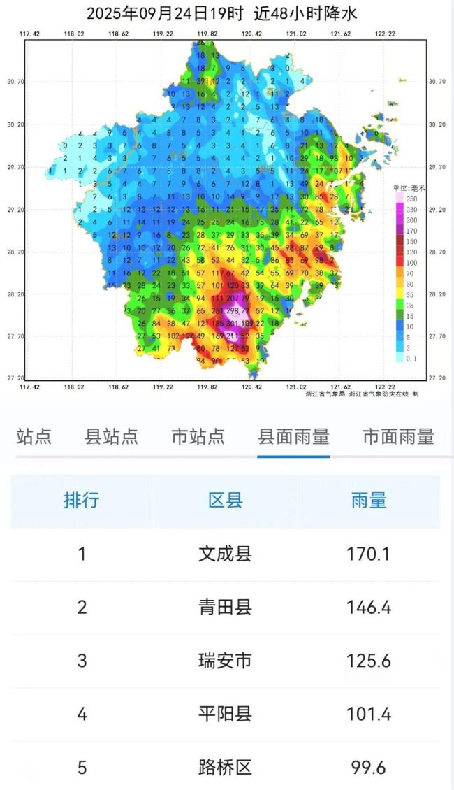 根据省气象台监测,9月22日19时至24日19时,浙江有14个县(市、区)累计降雨量超过50毫米,其中文成(170.1毫米)、青田(146.4毫米)、瑞安(125.5毫米)等地区降雨量较大。