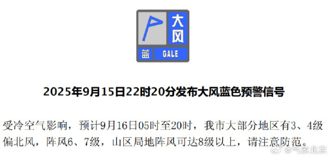 北京市气象台于2025年9月15日22时20分发布大风蓝色预警信号。受冷空气影响,预计9月16日5时至20时,北京市大部分地区将出现3到4级偏北风,阵风可达6到7级。山区局地阵风甚至可能达到8级以上,请市民注意防范。