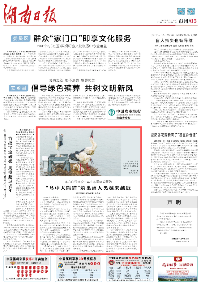 春日的洞庭湖生机勃勃。在湖南东洞庭湖国家级自然保护区岳阳县春风湖外滩,一座20余米高的监控铁塔顶端,一个直径近两米的鸟巢中,东方白鹳正在繁育后代。